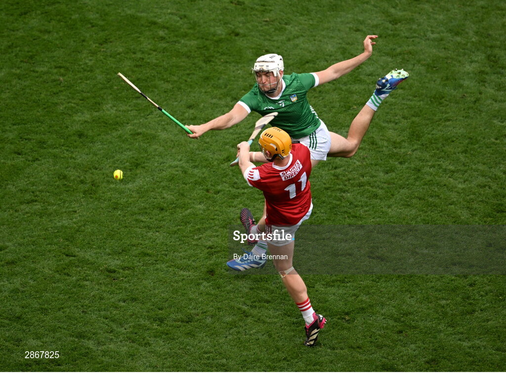 7 July 2024; Shane Barrett of Cork has his shot blocked by Kyle Hayes of Limerick during the GAA Hurling All-Ireland Senior Championship semi-final match between Limerick and Cork at Croke Park in Dublin. Photo by Daire Brennan/Sportsfile