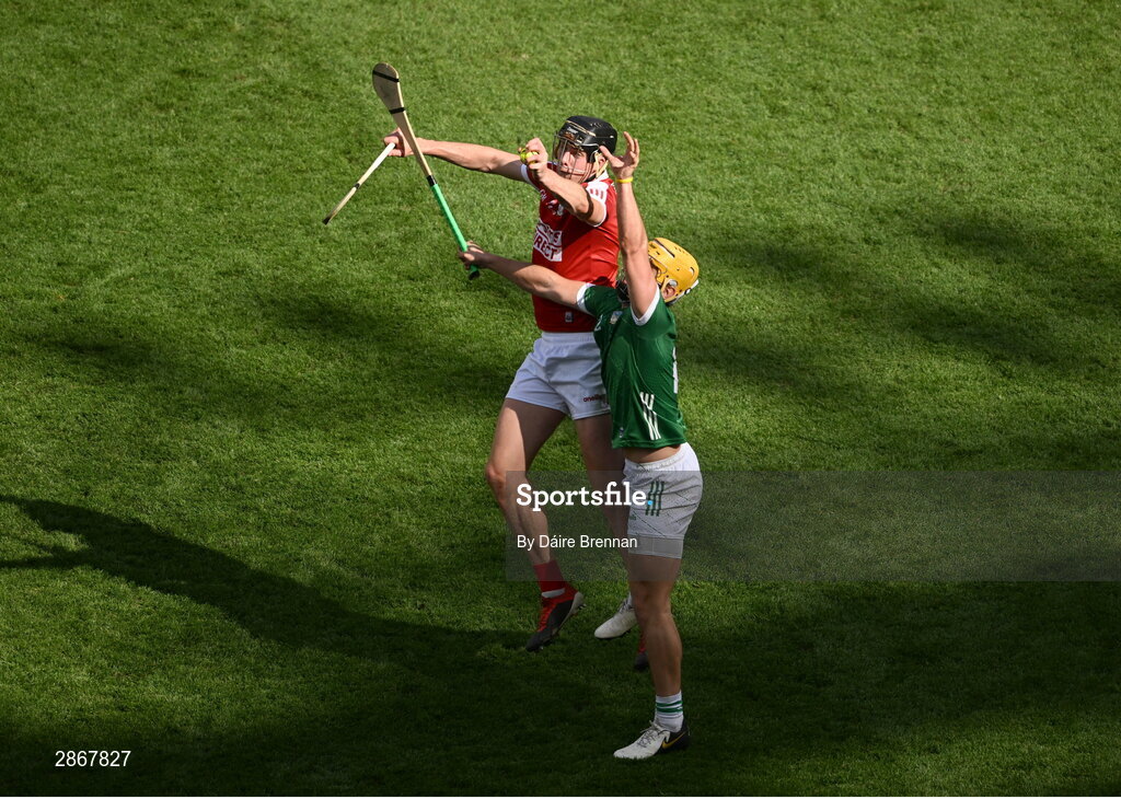 7 July 2024; Robert Downey of Cork in action against Tom Morrissey of Limerick during the GAA Hurling All-Ireland Senior Championship semi-final match between Limerick and Cork at Croke Park in Dublin. Photo by Daire Brennan/Sportsfile