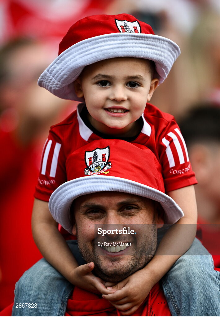 7 July 2024; Three year old Vasilios O'Donovan, from New York, with his Bantry born dad, Declan, after the GAA Hurling All-Ireland Senior Championship semi-final match between Limerick and Cork at Croke Park in Dublin. Photo by Ray McManus/Sportsfile