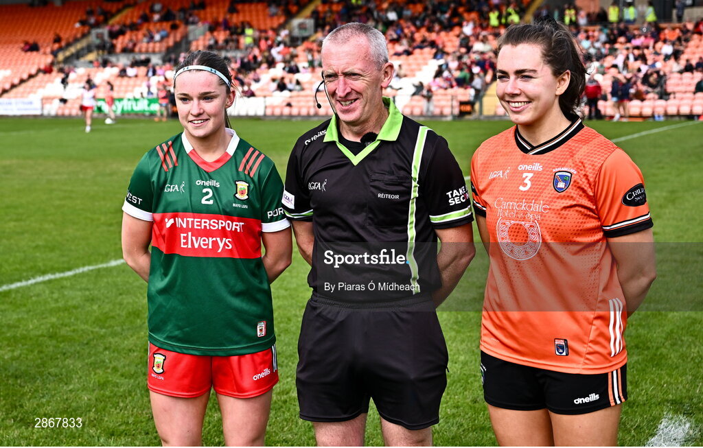7 July 2024; Referee Brendan Rice with team captains Saoirse Lally of Mayo and Clodagh McCambridge of Armagh before the TG4 All-Ireland Ladies Football Senior Championship quarter-final match between Armagh and Mayo at the BOX-IT Athletic Grounds in Armagh. Photo by Piaras Ó Mídheach/Sportsfile