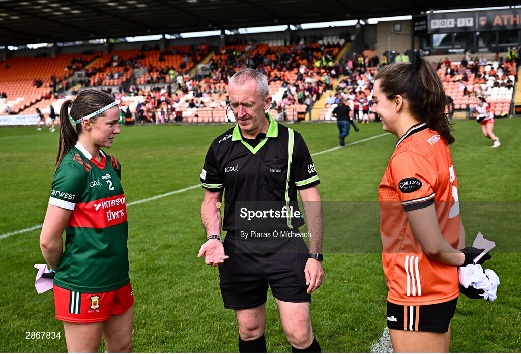 7 July 2024; Referee Brendan Rice performs the coin toss with team captains Saoirse Lally of Mayo and Clodagh McCambridge of Armagh before the TG4 All-Ireland Ladies Football Senior Championship quarter-final match between Armagh and Mayo at the BOX-IT Athletic Grounds in Armagh. Photo by Piaras Ó Mídheach/Sportsfile