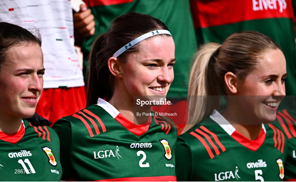 7 July 2024; Mayo players, from left, Annie Gough, Saoirse Lally and Eilis Ronayne before the TG4 All-Ireland Ladies Football Senior Championship quarter-final match between Armagh and Mayo at the BOX-IT Athletic Grounds in Armagh. Photo by Piaras Ó Mídheach/Sportsfile