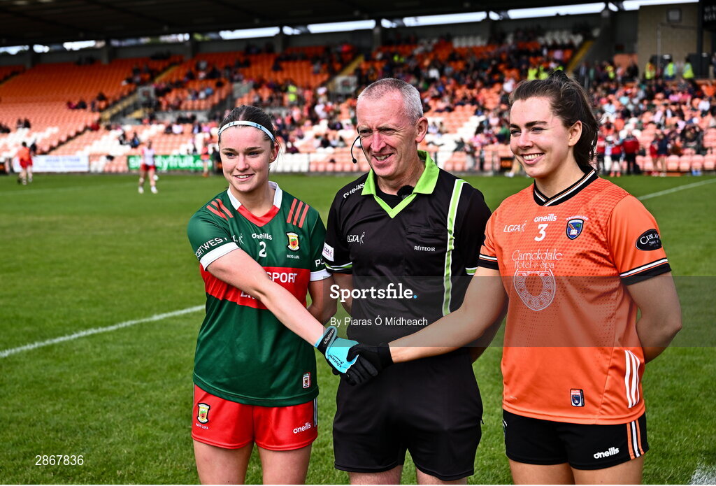 7 July 2024; Referee Brendan Rice with team captains Saoirse Lally of Mayo and Clodagh McCambridge of Armagh before the TG4 All-Ireland Ladies Football Senior Championship quarter-final match between Armagh and Mayo at the BOX-IT Athletic Grounds in Armagh. Photo by Piaras Ó Mídheach/Sportsfile