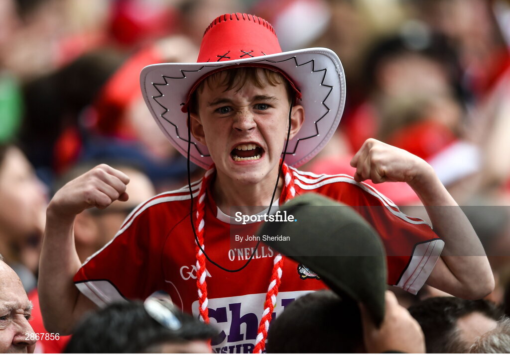 7 July 2024; A Cork supporter celebrates at the final whistle of the GAA Hurling All-Ireland Senior Championship semi-final match between Limerick and Cork at Croke Park in Dublin. Photo by John Sheridan/Sportsfile