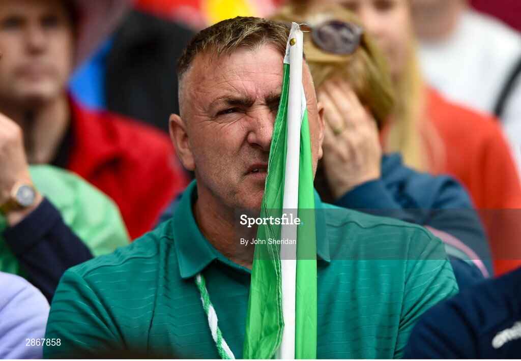 7 July 2024; A Limerick supporter looks on during the GAA Hurling All-Ireland Senior Championship semi-final match between Limerick and Cork at Croke Park in Dublin. Photo by John Sheridan/Sportsfile