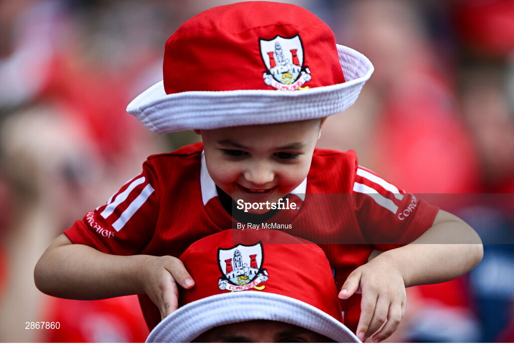 7 July 2024; Three year old Vasilios O'Donovan, from New York, sits on the sholders of his Bantry born dad after the GAA Hurling All-Ireland Senior Championship semi-final match between Limerick and Cork at Croke Park in Dublin. Photo by Ray McManus/Sportsfile
