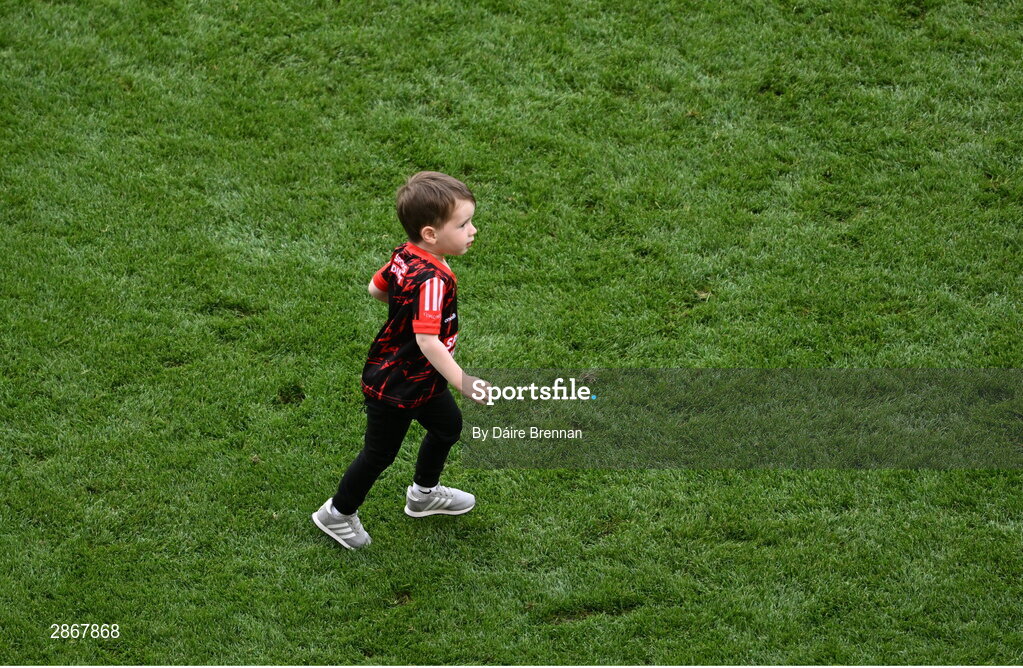 7 July 2024; Jack Horgan, aged 2, son of Cork player Patrick, on the field after the GAA Hurling All-Ireland Senior Championship semi-final match between Limerick and Cork at Croke Park in Dublin. Photo by Daire Brennan/Sportsfile