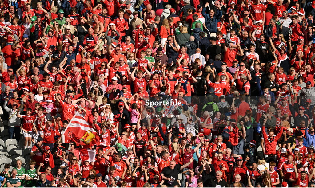 7 July 2024; Cork supporters in the Cusack Stand celebrate after the GAA Hurling All-Ireland Senior Championship semi-final match between Limerick and Cork at Croke Park in Dublin. Photo by Daire Brennan/Sportsfile