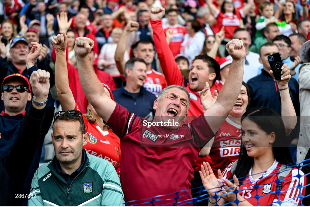 7 July 2024; Cork supporters celebrate after the GAA Hurling All-Ireland Senior Championship semi-final match between Limerick and Cork at Croke Park in Dublin. Photo by Stephen McCarthy/Sportsfile
