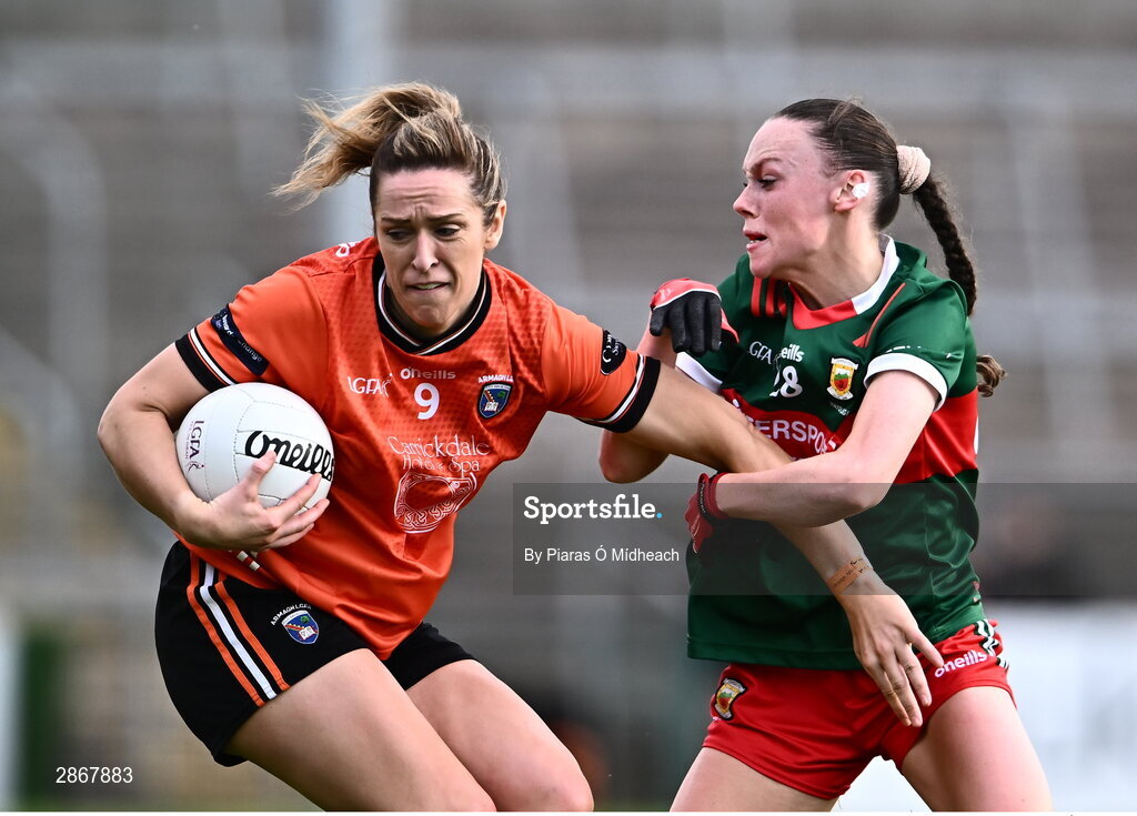 7 July 2024; Caroline O'Hanlon of Armagh in action against Lucy Wallace of Mayo during the TG4 All-Ireland Ladies Football Senior Championship quarter-final match between Armagh and Mayo at the BOX-IT Athletic Grounds in Armagh. Photo by Piaras Ó Mídheach/Sportsfile