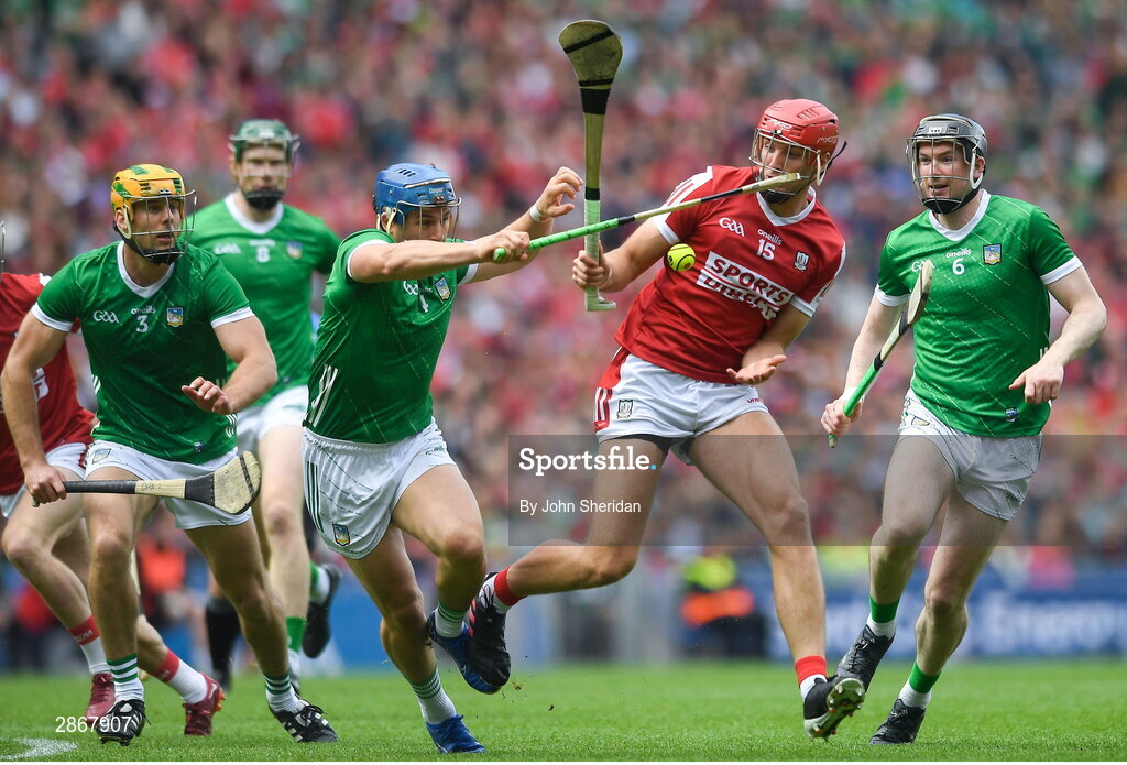 7 July 2024; Brian Hayes of Cork is tackled by Mike Casey of Limerick, left, as teammate Declan Hannon looks on during the GAA Hurling All-Ireland Senior Championship semi-final match between Limerick and Cork at Croke Park in Dublin. Photo by John Sheridan/Sportsfile