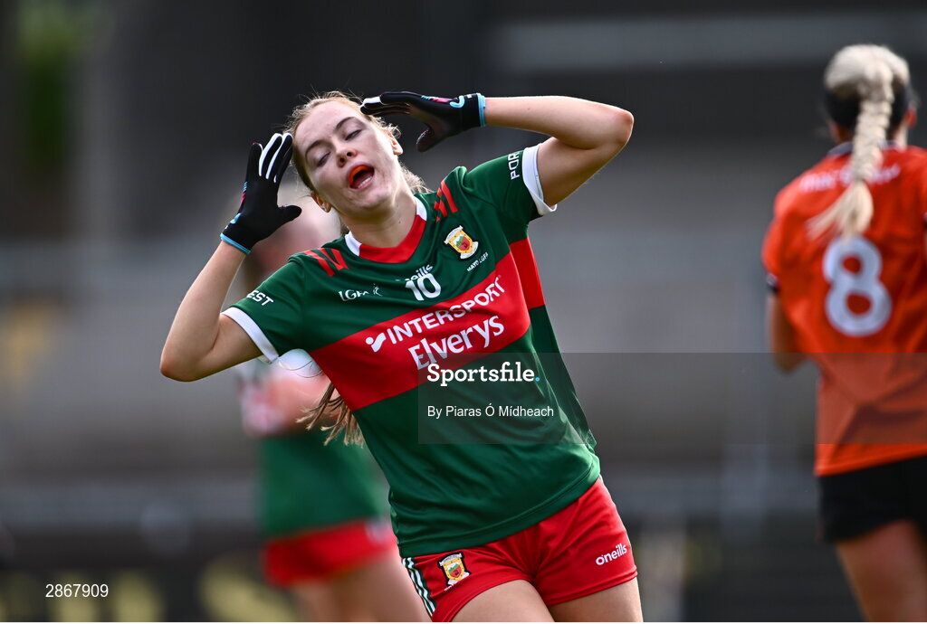 7 July 2024; Fionnuala McLaughlin of Mayo reacts after a missed chance during the TG4 All-Ireland Ladies Football Senior Championship quarter-final match between Armagh and Mayo at the BOX-IT Athletic Grounds in Armagh. Photo by Piaras Ó Mídheach/Sportsfile