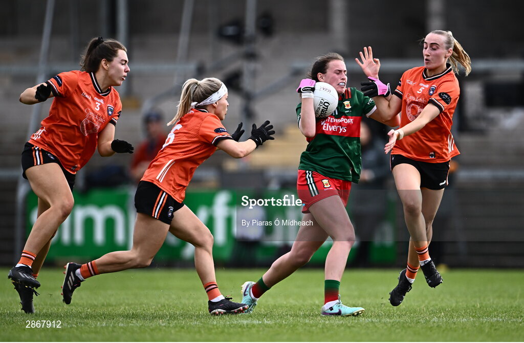 7 July 2024; Annie Gough of Mayo in action against Armagh players, from left, Clodagh McCambridge, Lauren McConville and Cáit Towe during the TG4 All-Ireland Ladies Football Senior Championship quarter-final match between Armagh and Mayo at the BOX-IT Athletic Grounds in Armagh. Photo by Piaras Ó Mídheach/Sportsfile