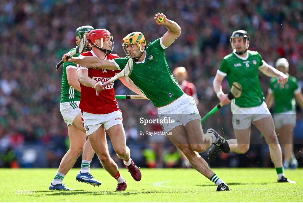7 July 2024; Dan Morrissey of Limerick is tackled by Alan Connolly of Cork during the GAA Hurling All-Ireland Senior Championship semi-final match between Limerick and Cork at Croke Park in Dublin. Photo by Ray McManus/Sportsfile