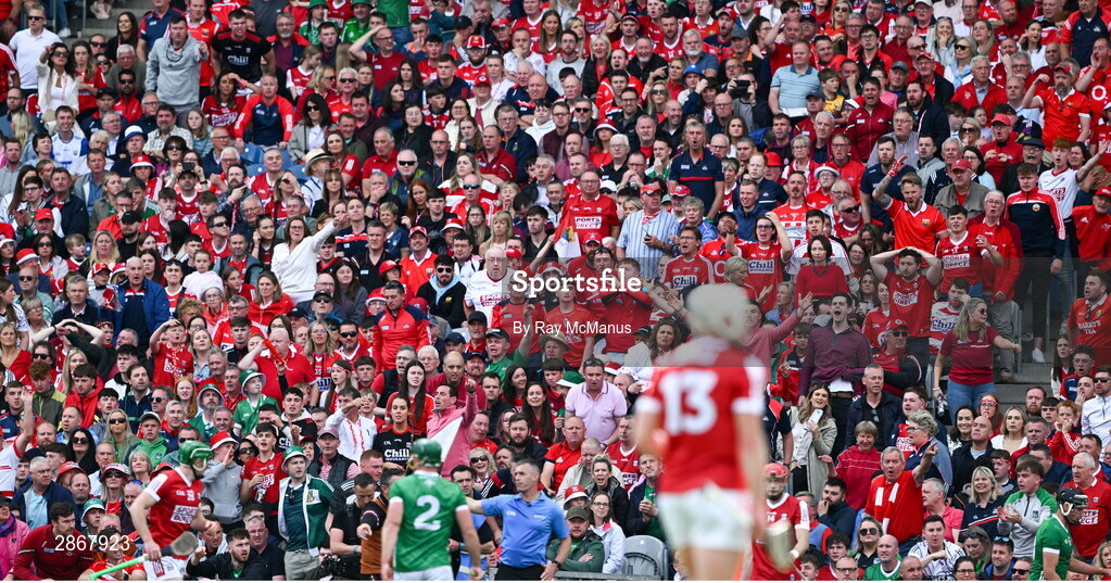 7 July 2024; Cork supporters, in the Hogan Stand, remonstrate over a line ball decision during the GAA Hurling All-Ireland Senior Championship semi-final match between Limerick and Cork at Croke Park in Dublin. Photo by Ray McManus/Sportsfile