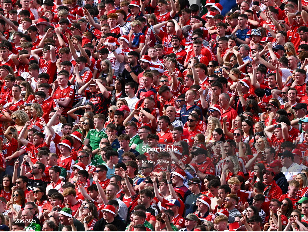 7 July 2024; Cork supporters, on Hill 16, and a few Limerick during the closing minutes of the GAA Hurling All-Ireland Senior Championship semi-final match between Limerick and Cork at Croke Park in Dublin. Photo by Ray McManus/Sportsfile