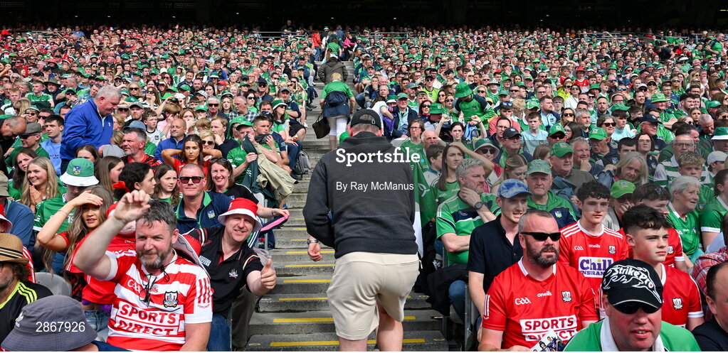 7 July 2024; Limerick supporters, in the Cusack Stand, head for the exits before the finish of the GAA Hurling All-Ireland Senior Championship semi-final match between Limerick and Cork at Croke Park in Dublin. Photo by Ray McManus/Sportsfile