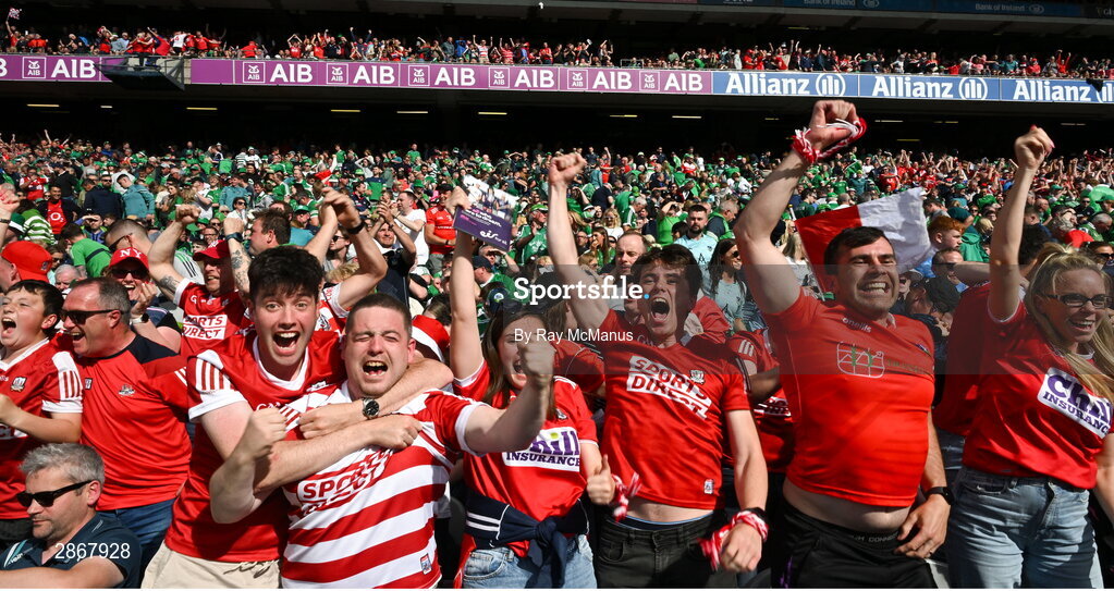7 July 2024; Cork supporters, in the Cusack Stand, celebrate as the final whistle blows in the GAA Hurling All-Ireland Senior Championship semi-final match between Limerick and Cork at Croke Park in Dublin. Photo by Ray McManus/Sportsfile