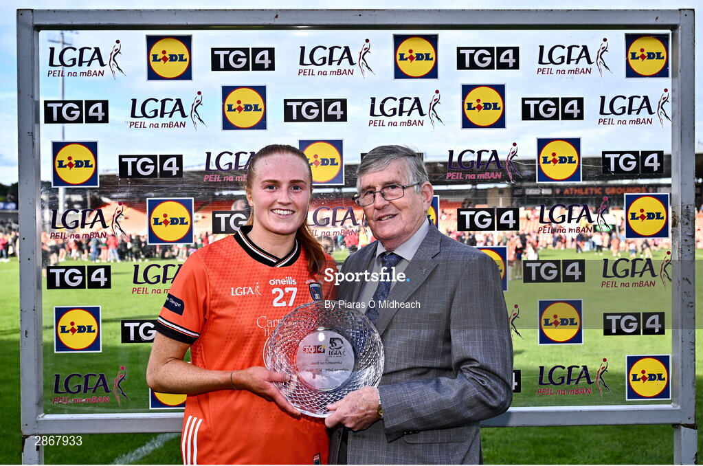 7 July 2024; Blaithín Mackin of Armagh is presented with the Player of the Match award by Hugh Devenney, on behalf of the LGFA, during the TG4 All-Ireland Ladies Football Senior Championship quarter-final match between Armagh and Mayo at the BOX-IT Athletic Grounds in Armagh. Photo by Piaras Ó Mídheach/Sportsfile