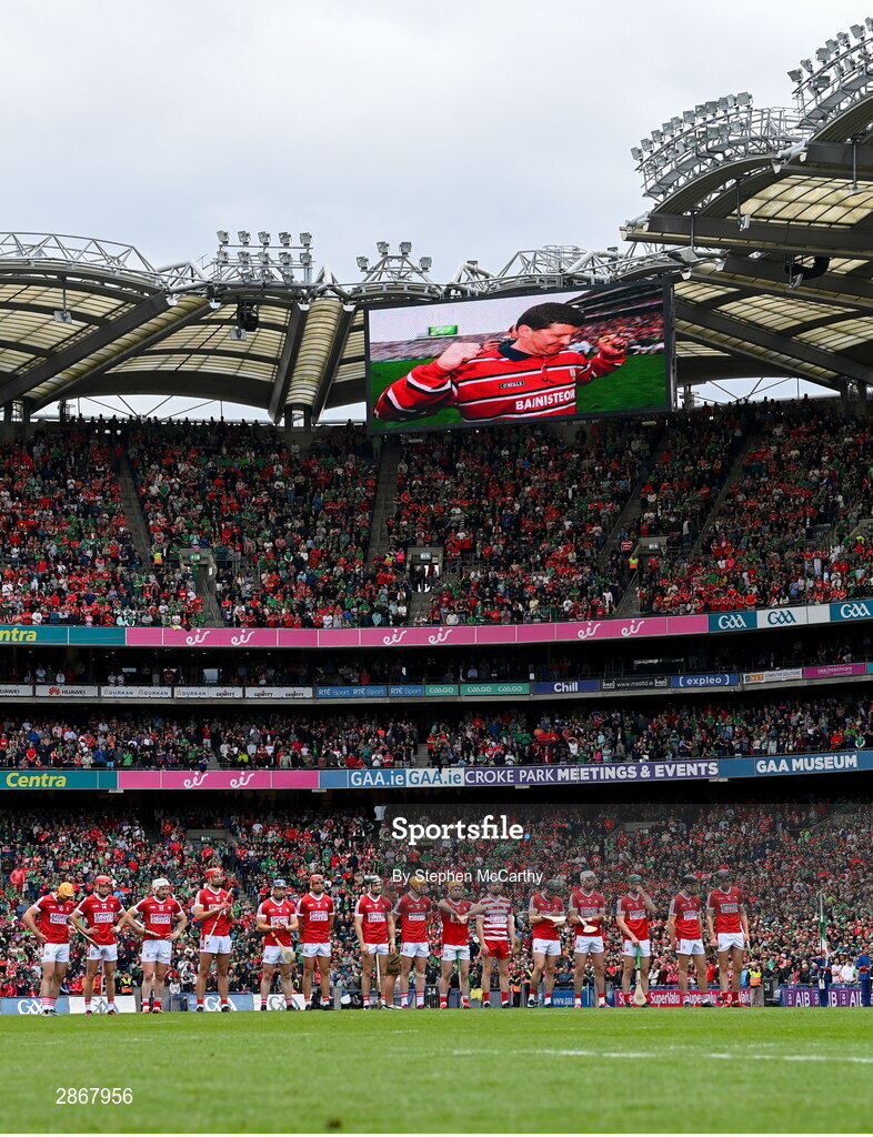 7 July 2024; Players and spectators during a tribute to the late John O'Mahony former Galway, Mayo and Leitrim manager, before the GAA Hurling All-Ireland Senior Championship semi-final match between Limerick and Cork at Croke Park in Dublin. Photo by Stephen McCarthy/Sportsfile