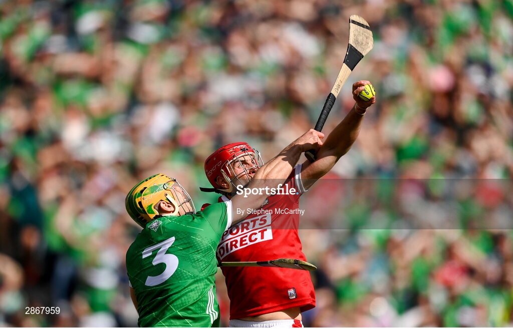 7 July 2024; Brian Hayes of Cork in action against Dan Morrissey of Limerick during the GAA Hurling All-Ireland Senior Championship semi-final match between Limerick and Cork at Croke Park in Dublin. Photo by Stephen McCarthy/Sportsfile