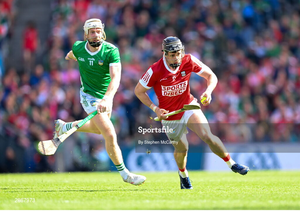 7 July 2024; Darragh Fitzgibbon of Cork in action against Cian Lynch of Limerick during the GAA Hurling All-Ireland Senior Championship semi-final match between Limerick and Cork at Croke Park in Dublin. Photo by Stephen McCarthy/Sportsfile