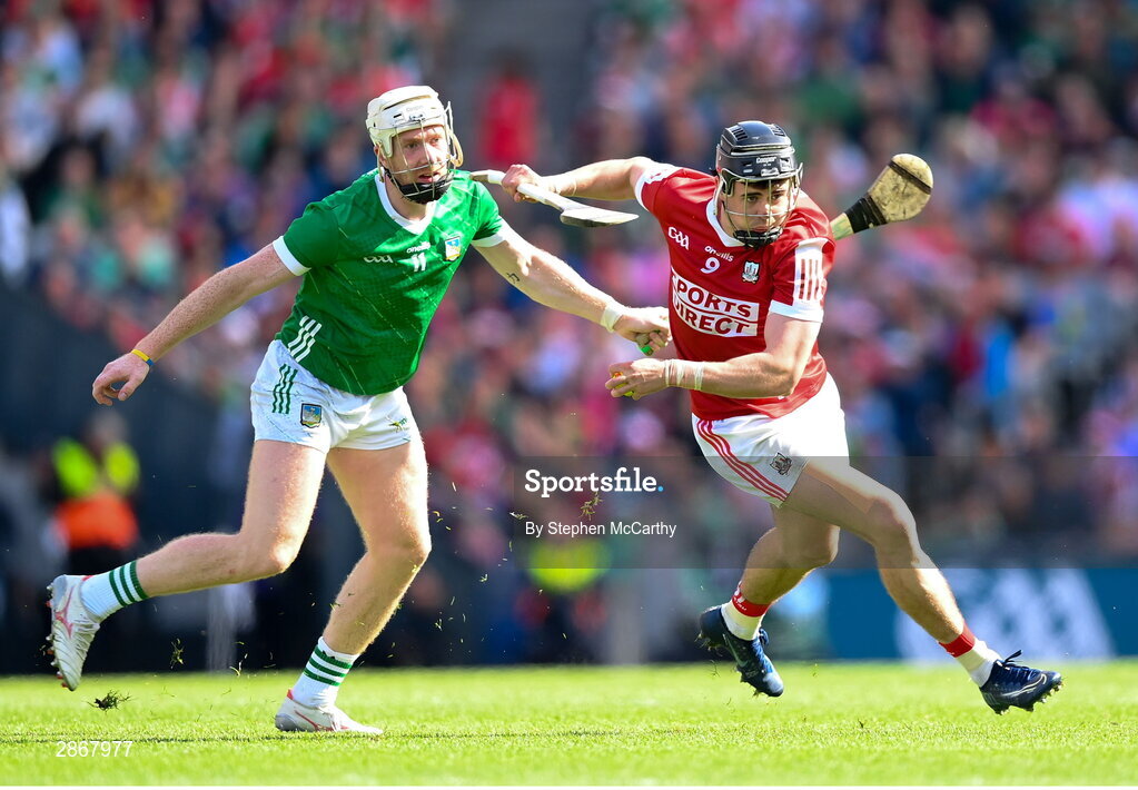 7 July 2024; Darragh Fitzgibbon of Cork in action against Cian Lynch of Limerick during the GAA Hurling All-Ireland Senior Championship semi-final match between Limerick and Cork at Croke Park in Dublin. Photo by Stephen McCarthy/Sportsfile