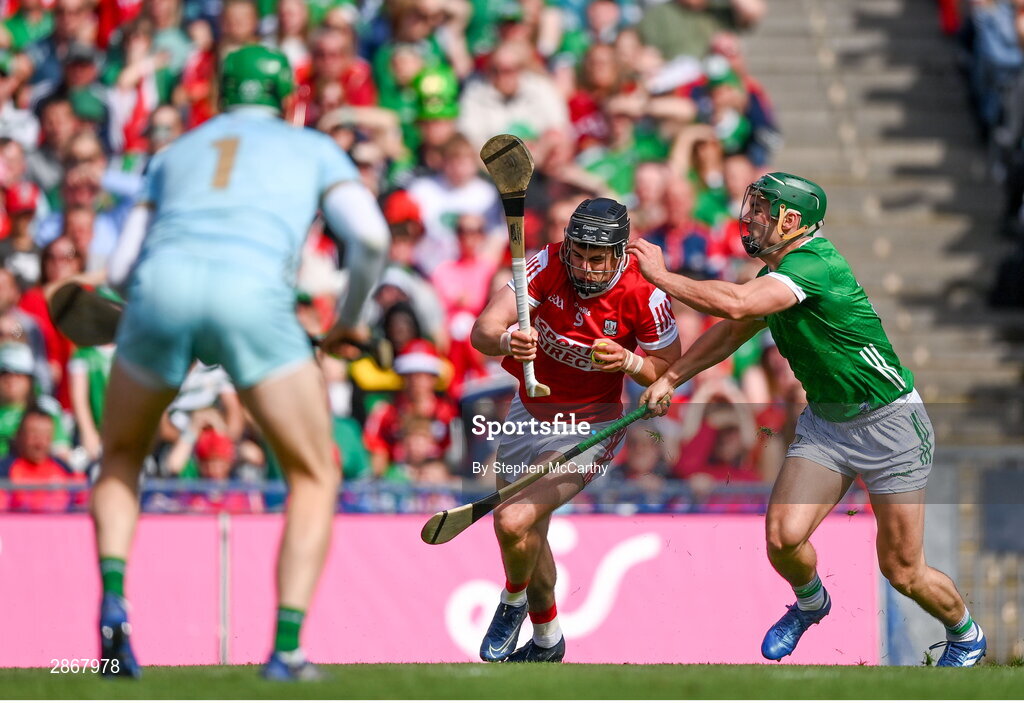 7 July 2024; Darragh Fitzgibbon of Cork is tackled by Sean Finn of Limerick during the GAA Hurling All-Ireland Senior Championship semi-final match between Limerick and Cork at Croke Park in Dublin. Photo by Stephen McCarthy/Sportsfile