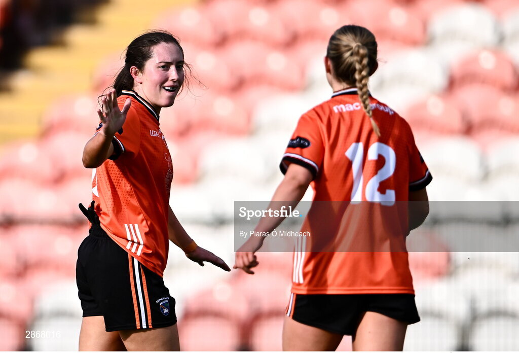 7 July 2024; Armagh players Niamh Reel, left, and Sarah Quigley celebrate after their side's victory in the TG4 All-Ireland Ladies Football Senior Championship quarter-final match between Armagh and Mayo at the BOX-IT Athletic Grounds in Armagh. Photo by Piaras Ó Mídheach/Sportsfile