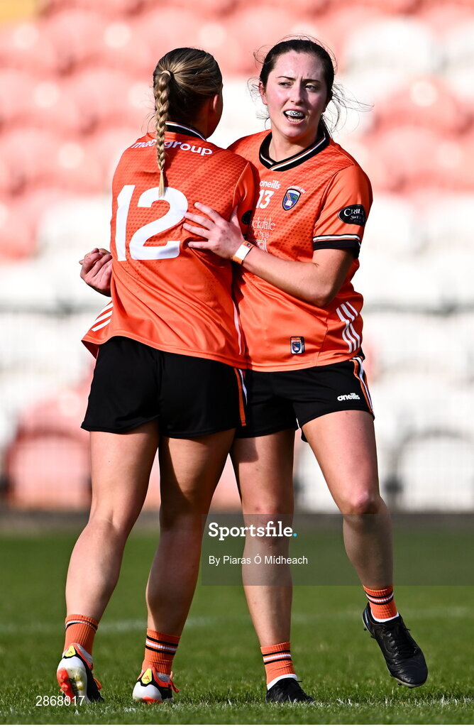 7 July 2024; Armagh players Niamh Reel, right, and Sarah Quigley celebrate after their side's victory in the TG4 All-Ireland Ladies Football Senior Championship quarter-final match between Armagh and Mayo at the BOX-IT Athletic Grounds in Armagh. Photo by Piaras Ó Mídheach/Sportsfile