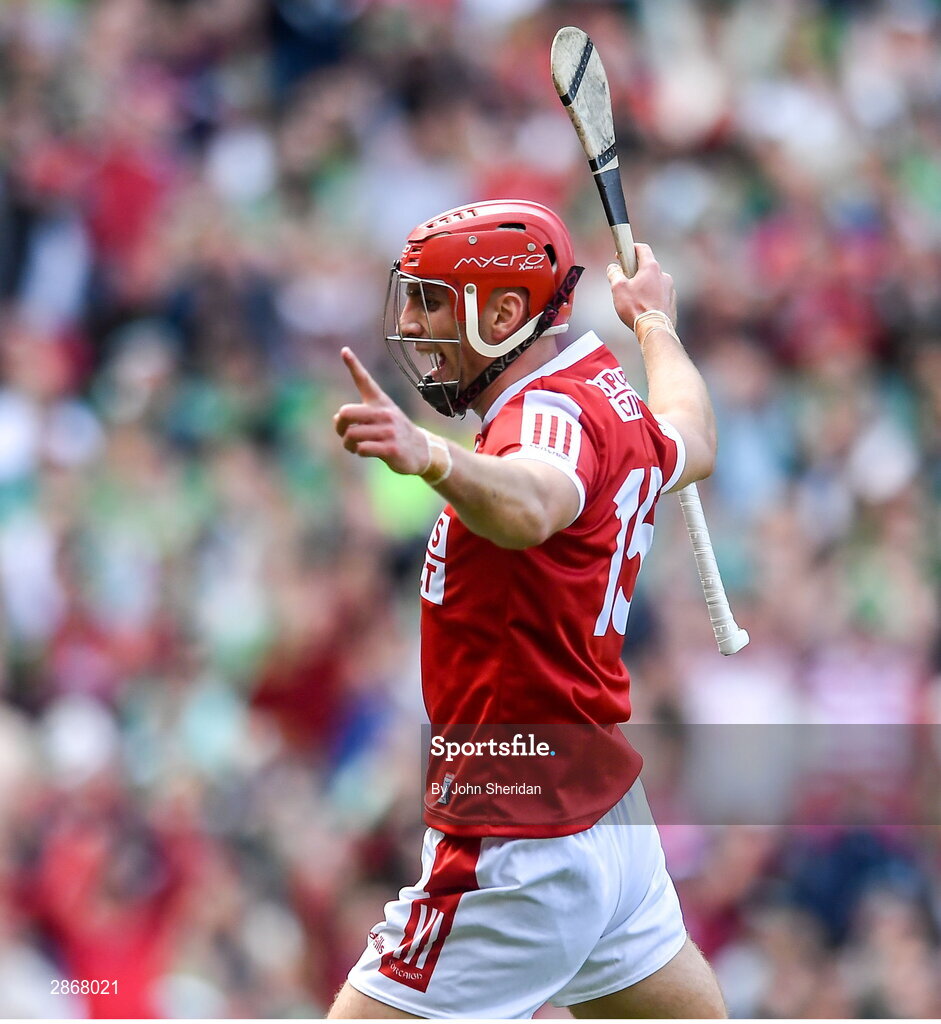 7 July 2024; Brian Hayes of Cork celebrates after scoring his side's first goal during the GAA Hurling All-Ireland Senior Championship semi-final match between Limerick and Cork at Croke Park in Dublin. Photo by John Sheridan/Sportsfile