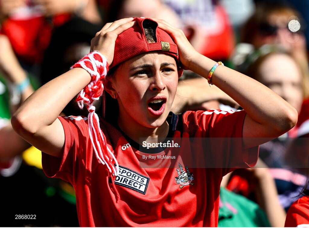 7 July 2024; Cork supporter Julia Twohig, aged 12, celebrates a score during the GAA Hurling All-Ireland Senior Championship semi-final match between Limerick and Cork at Croke Park in Dublin. Photo by Ray McManus/Sportsfile