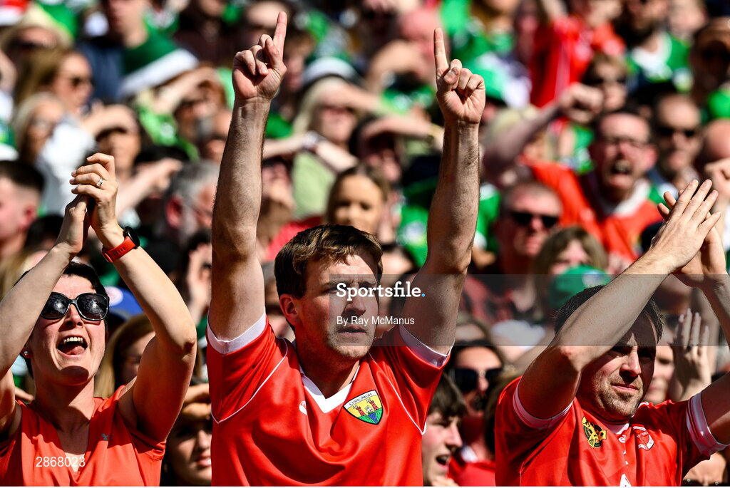7 July 2024; Cork supporters, in the Cusack Stand, celebrate a score during the GAA Hurling All-Ireland Senior Championship semi-final match between Limerick and Cork at Croke Park in Dublin. Photo by Ray McManus/Sportsfile