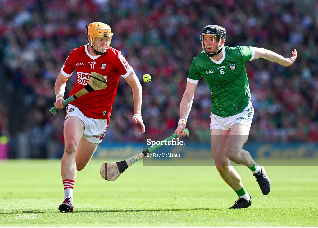 7 July 2024; Shane Barrett of Cork is tackled by Declan Hannon of Limerick during the GAA Hurling All-Ireland Senior Championship semi-final match between Limerick and Cork at Croke Park in Dublin. Photo by Ray McManus/Sportsfile