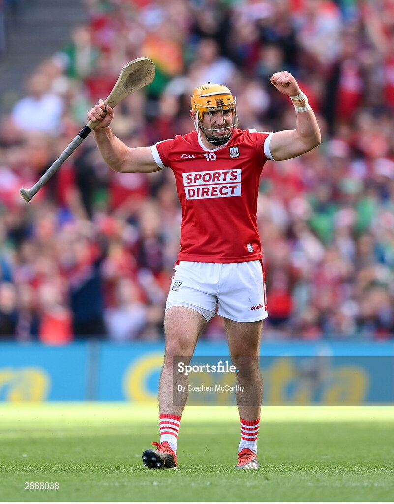 7 July 2024; Declan Dalton of Cork celebrates a score during the GAA Hurling All-Ireland Senior Championship semi-final match between Limerick and Cork at Croke Park in Dublin. Photo by Stephen McCarthy/Sportsfile