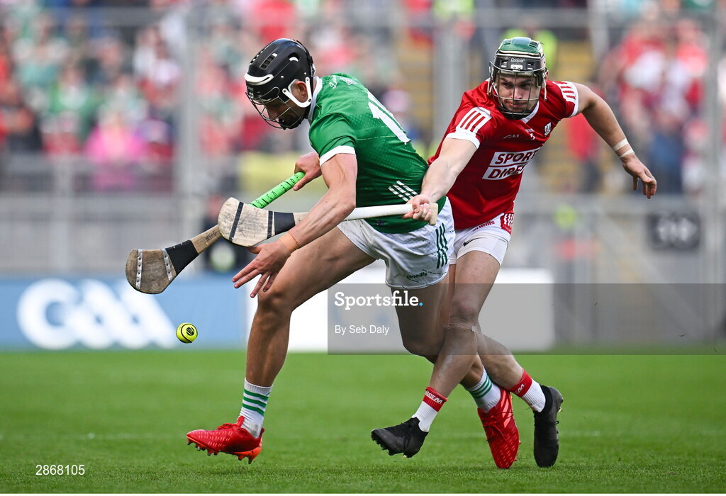 7 July 2024; Gearóid Hegarty of Limerick in action against Mark Coleman of Cork during the GAA Hurling All-Ireland Senior Championship semi-final match between Limerick and Cork at Croke Park in Dublin. Photo by Seb Daly/Sportsfile