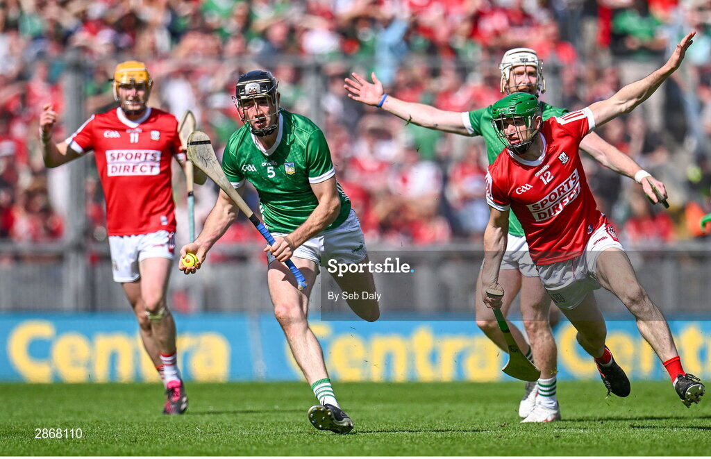 7 July 2024; Diarmaid Byrnes of Limerick in action against Séamus Harnedy of Cork during the GAA Hurling All-Ireland Senior Championship semi-final match between Limerick and Cork at Croke Park in Dublin. Photo by Seb Daly/Sportsfile