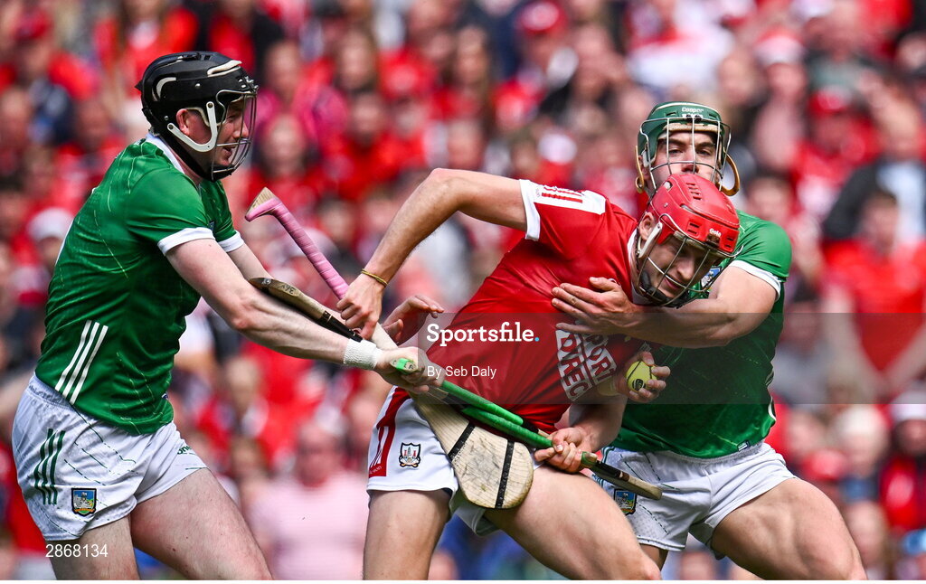 7 July 2024; Alan Connolly of Cork in action against Limerick players Declan Hannon, left, and Seán Finn during the GAA Hurling All-Ireland Senior Championship semi-final match between Limerick and Cork at Croke Park in Dublin. Photo by Seb Daly/Sportsfile