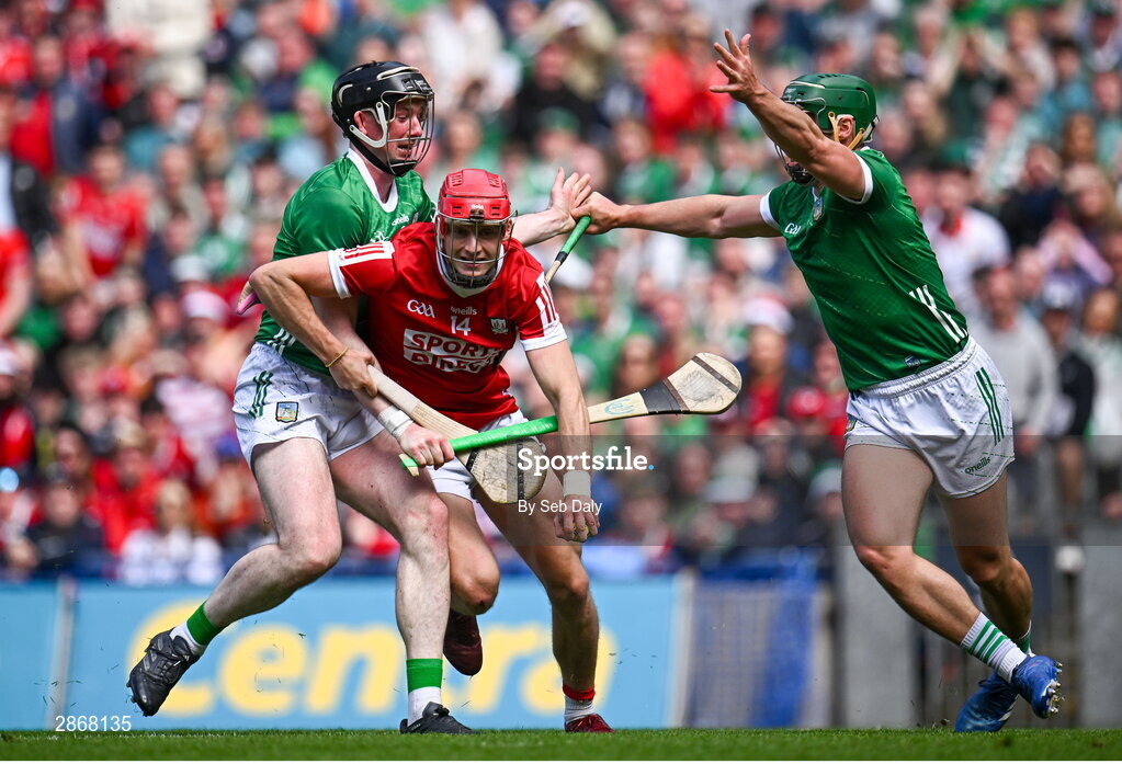 7 July 2024; Alan Connolly of Cork in action against Limerick players Declan Hannon, left, and Seán Finn during the GAA Hurling All-Ireland Senior Championship semi-final match between Limerick and Cork at Croke Park in Dublin. Photo by Seb Daly/Sportsfile