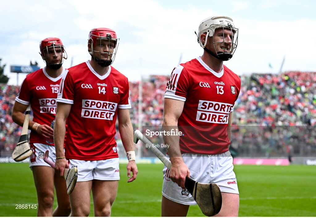 7 July 2024; Cork players, from right, Patrick Horgan, Alan Connolly, and Brian Hayes before the GAA Hurling All-Ireland Senior Championship semi-final match between Limerick and Cork at Croke Park in Dublin. Photo by Seb Daly/Sportsfile