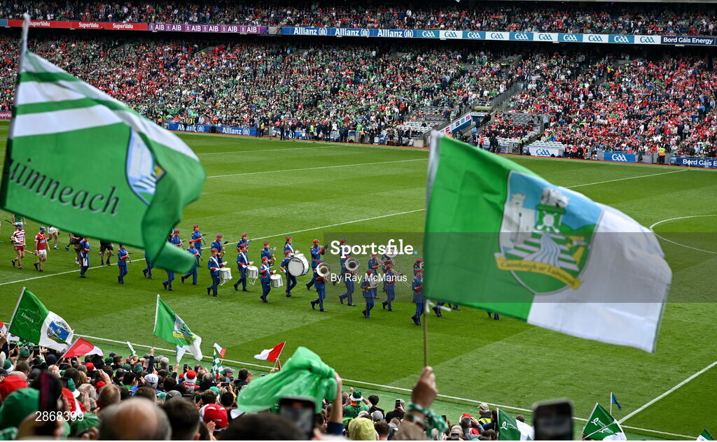 7 July 2024; The Limerick and Cork teams follow the Artane Band in the pre match parade before the GAA Hurling All-Ireland Senior Championship semi-final match between Limerick and Cork at Croke Park in Dublin. Photo by Ray McManus/Sportsfile