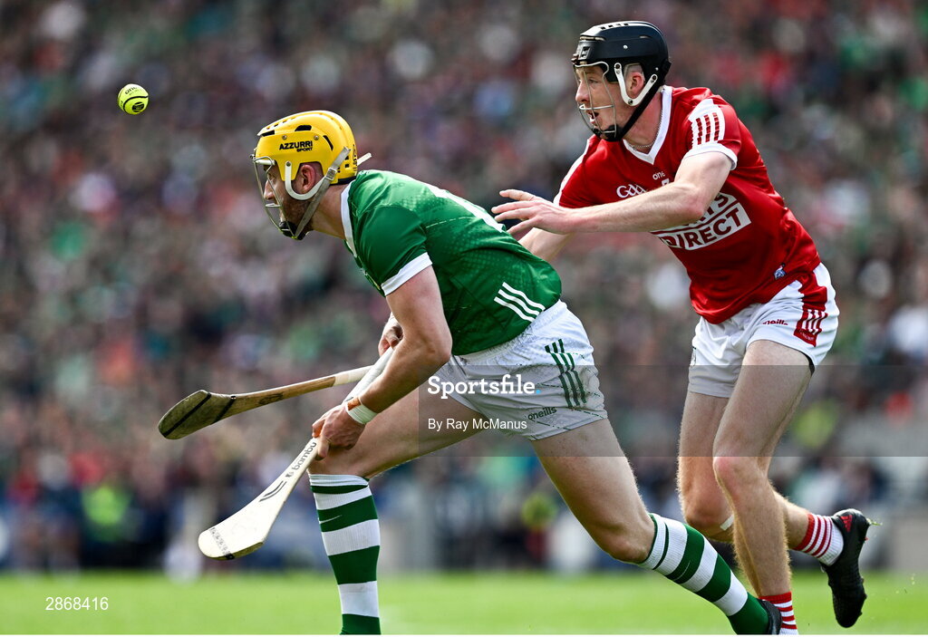 7 July 2024; Seamus Flanagan of Limerick is tackled by Eoin Downey of Cork during the GAA Hurling All-Ireland Senior Championship semi-final match between Limerick and Cork at Croke Park in Dublin. Photo by Ray McManus/Sportsfile