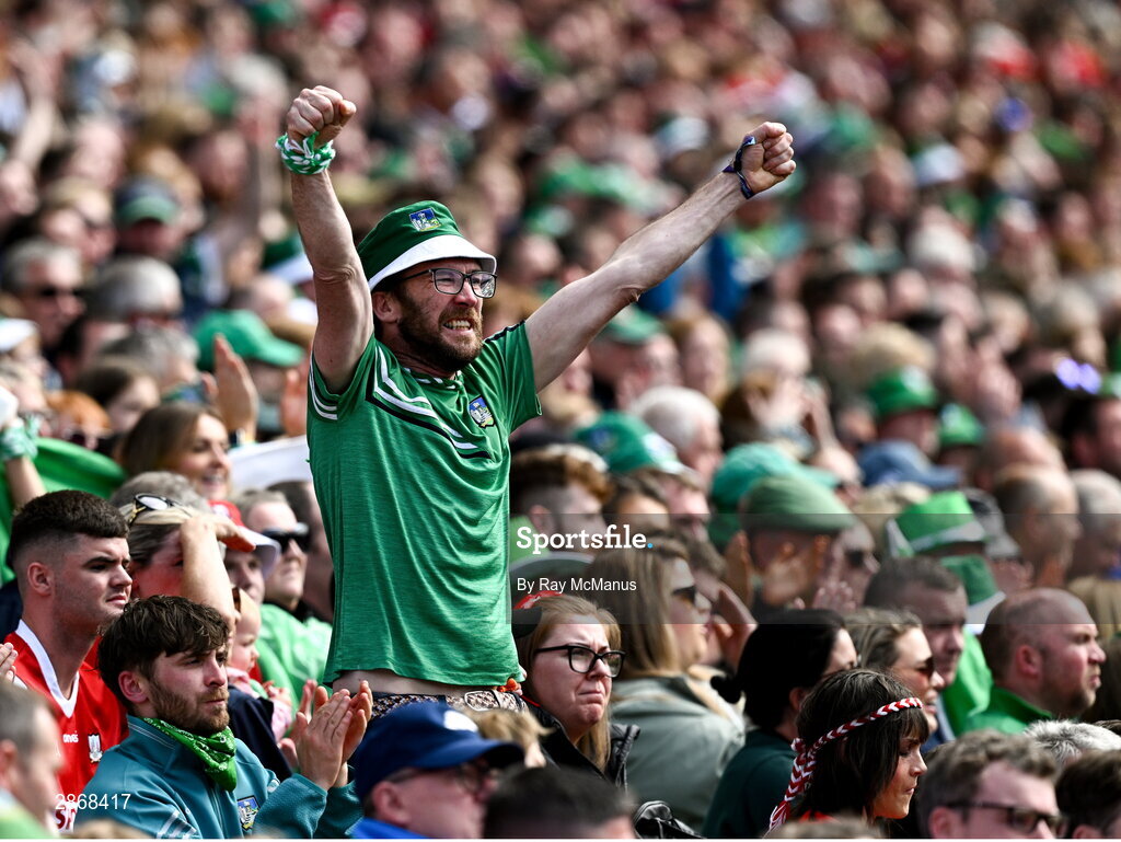 7 July 2024; A Limerick supporter, in the Cusack Stand, celebrates an early score during the GAA Hurling All-Ireland Senior Championship semi-final match between Limerick and Cork at Croke Park in Dublin. Photo by Ray McManus/Sportsfile