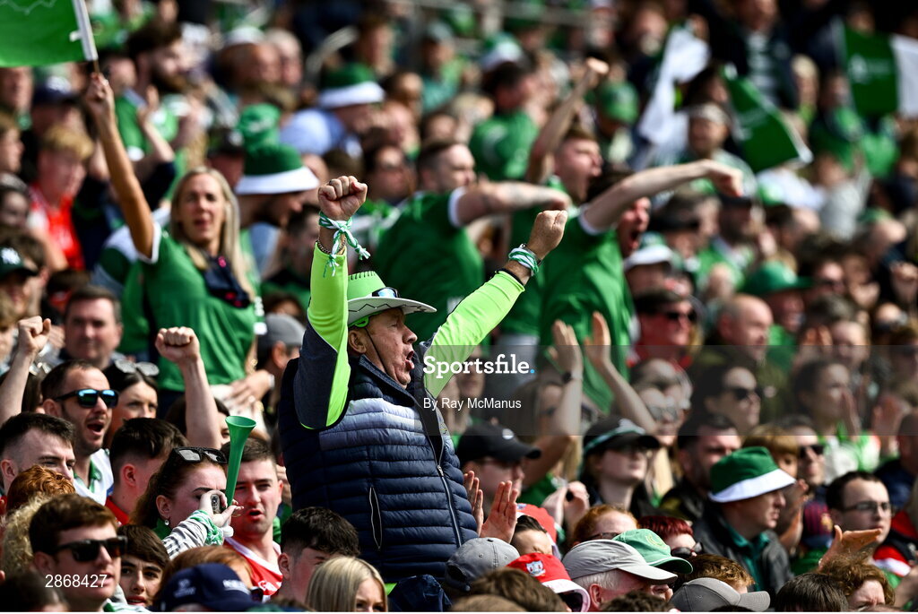7 July 2024; Limerick supporters celebrate a score during the GAA Hurling All-Ireland Senior Championship semi-final match between Limerick and Cork at Croke Park in Dublin. Photo by Ray McManus/Sportsfile