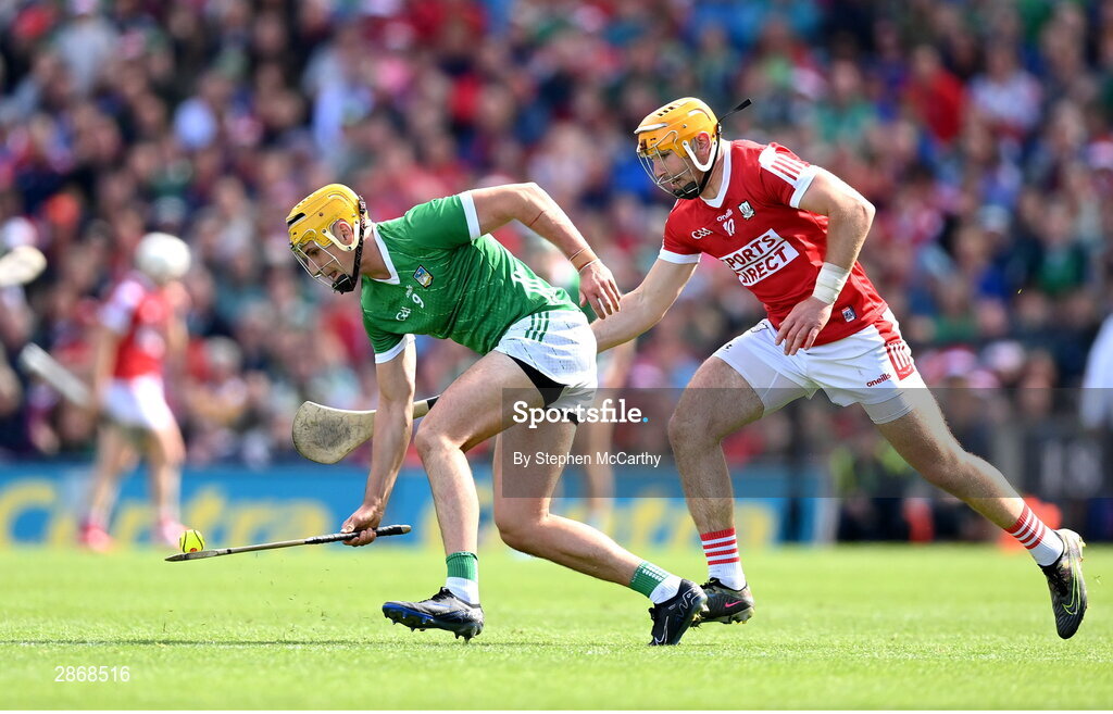 7 July 2024; Cathal O'Neill of Limerick and Declan Dalton of Cork during the GAA Hurling All-Ireland Senior Championship semi-final match between Limerick and Cork at Croke Park in Dublin. Photo by Stephen McCarthy/Sportsfile