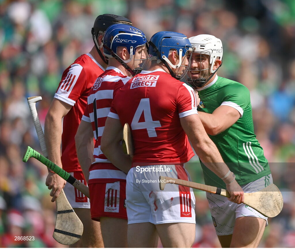 7 July 2024; Aaron Gillane of Limerick with Cork players, Sean O'Donoghue, 4, Patrick Collins, 1, and Eoin Downey during the GAA Hurling All-Ireland Senior Championship semi-final match between Limerick and Cork at Croke Park in Dublin. Photo by Stephen McCarthy/Sportsfile
