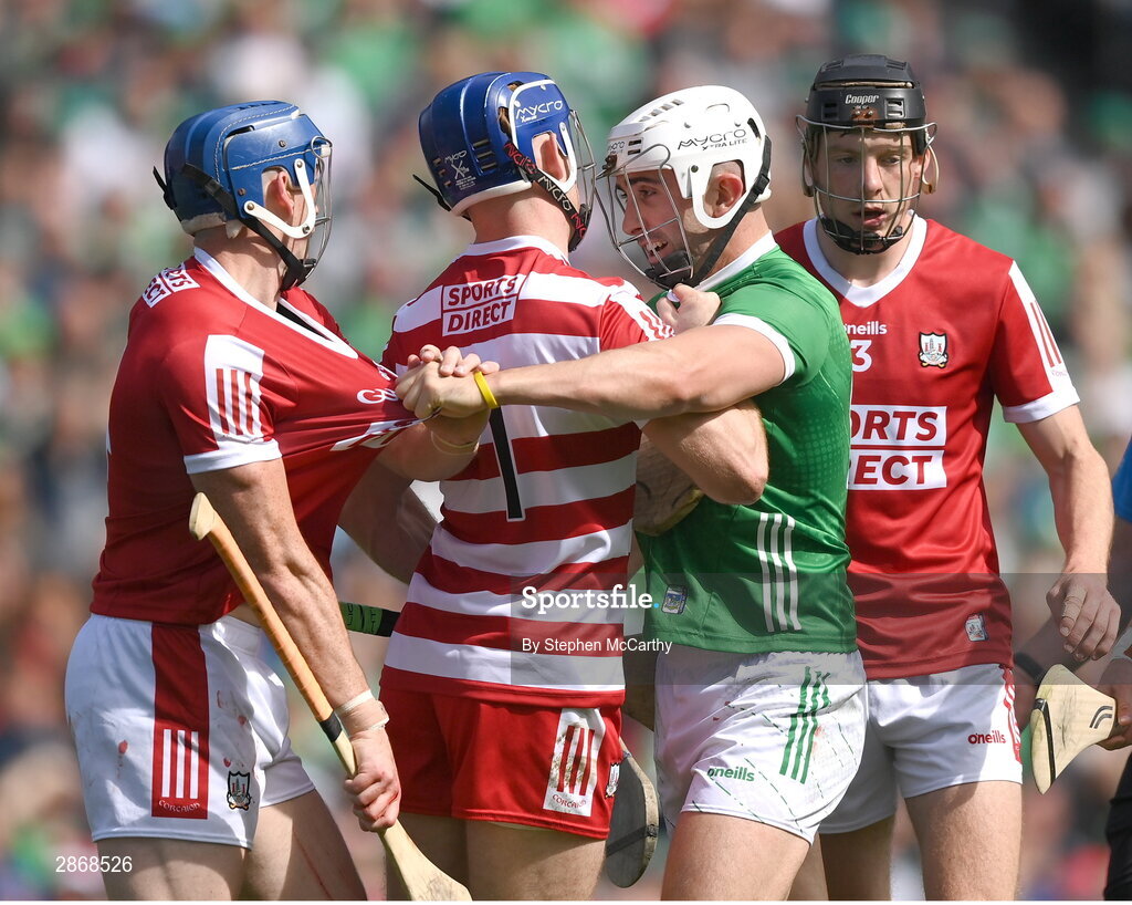 7 July 2024; Aaron Gillane of Limerick with Cork players, Sean O'Donoghue, 4, goalkeeper Patrick Collins and Eoin Downey, right, during the GAA Hurling All-Ireland Senior Championship semi-final match between Limerick and Cork at Croke Park in Dublin. Photo by Stephen McCarthy/Sportsfile