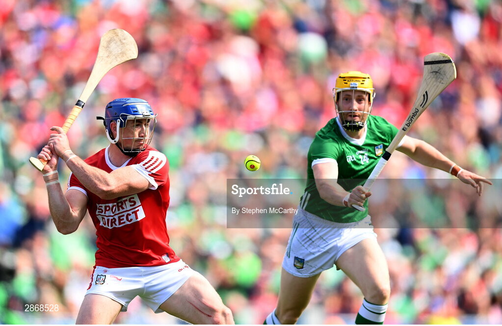 7 July 2024; Sean O'Donoghue of Cork and Seamus Flanagan of Limerick during the GAA Hurling All-Ireland Senior Championship semi-final match between Limerick and Cork at Croke Park in Dublin. Photo by Stephen McCarthy/Sportsfile