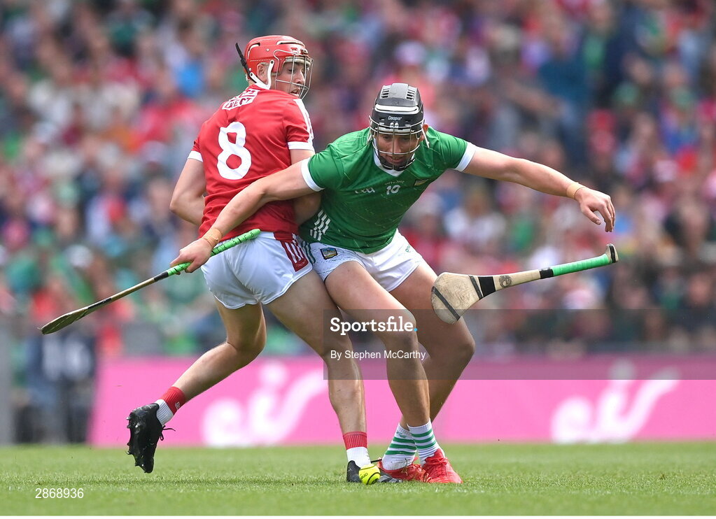 7 July 2024; Gearóid Hegarty of Limerick in action against Ciarán Joyce of Cork during the GAA Hurling All-Ireland Senior Championship semi-final match between Limerick and Cork at Croke Park in Dublin. Photo by Stephen McCarthy/Sportsfile