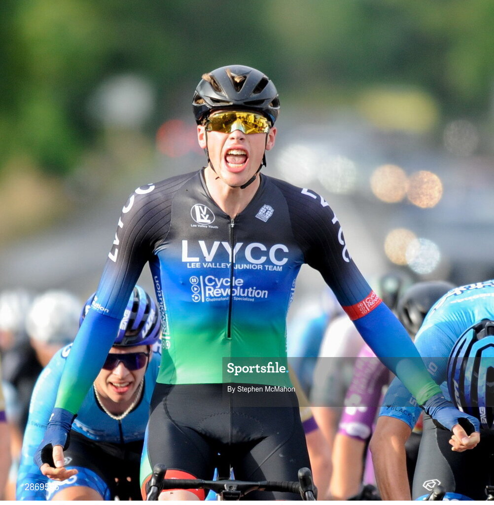 9 July 2024; Wiliam Gilbank of Lee Valley Youth CC team after winning stage one of the 2024 Junior Tour of Ireland at the Maghera stage in Clare. Photo by Stephen McMahon/Sportsfile